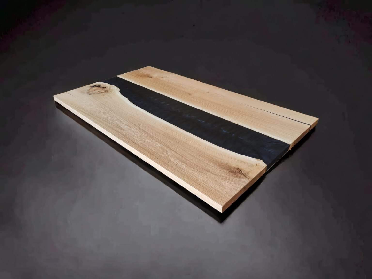 Masivna jedilna miza iz lepljene plošče hrast z dodatkom epoksi smole.