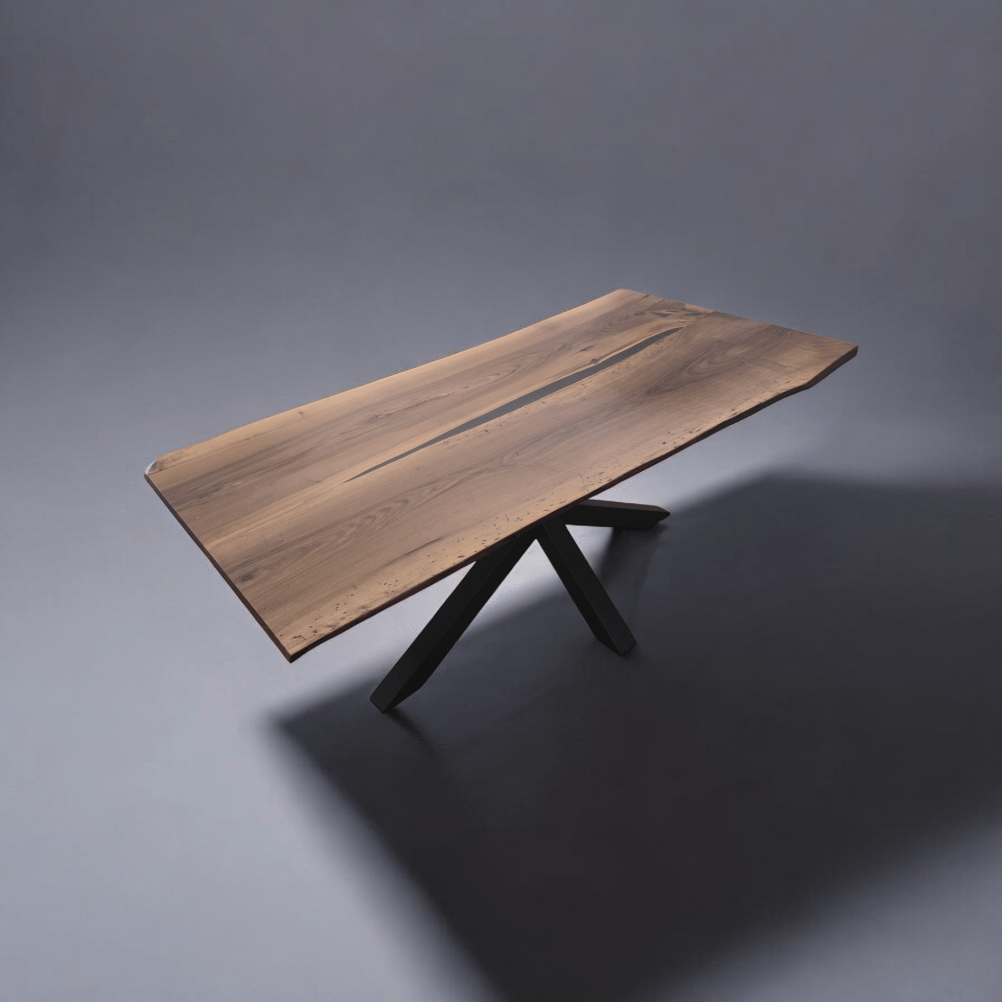 Ta masivna jedilna miza je izdelana iz lepljene plošče evropskega oreha z dodatkom črne epoksi smole. Standardna višina mize je 76 cm, debelina plošče je 4 cm, dimenzije pa so 210×100 cm. Površina je lakirana za dolgotrajno zaščito in enostavno vzdrževanje. Na voljo je izbira različnih podnožij: Model U, Model X, Križ, Asimetrična, Plus, Spider, Model I in Modern. Miza je na voljo takoj, brez čakanja. | masivne-mize.si