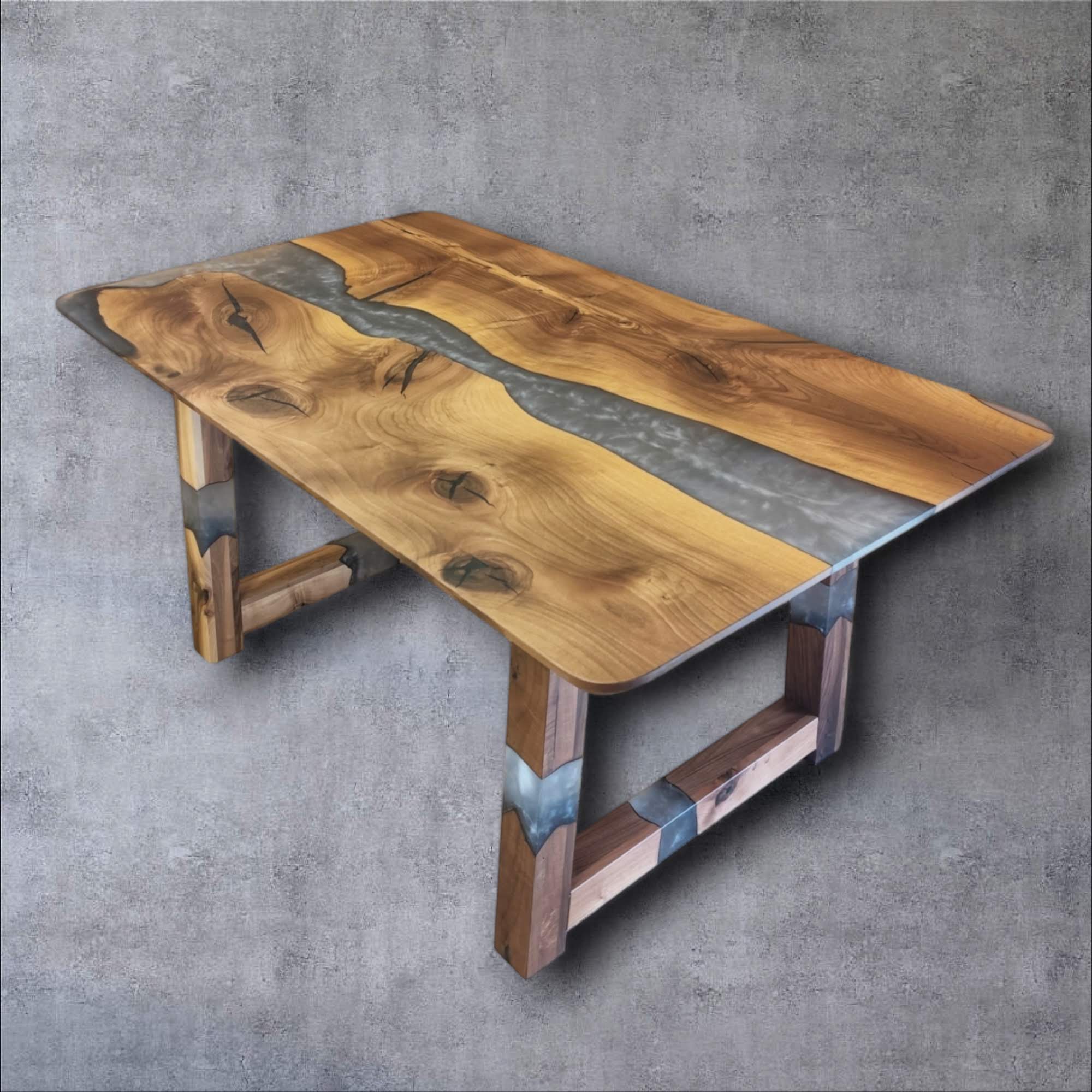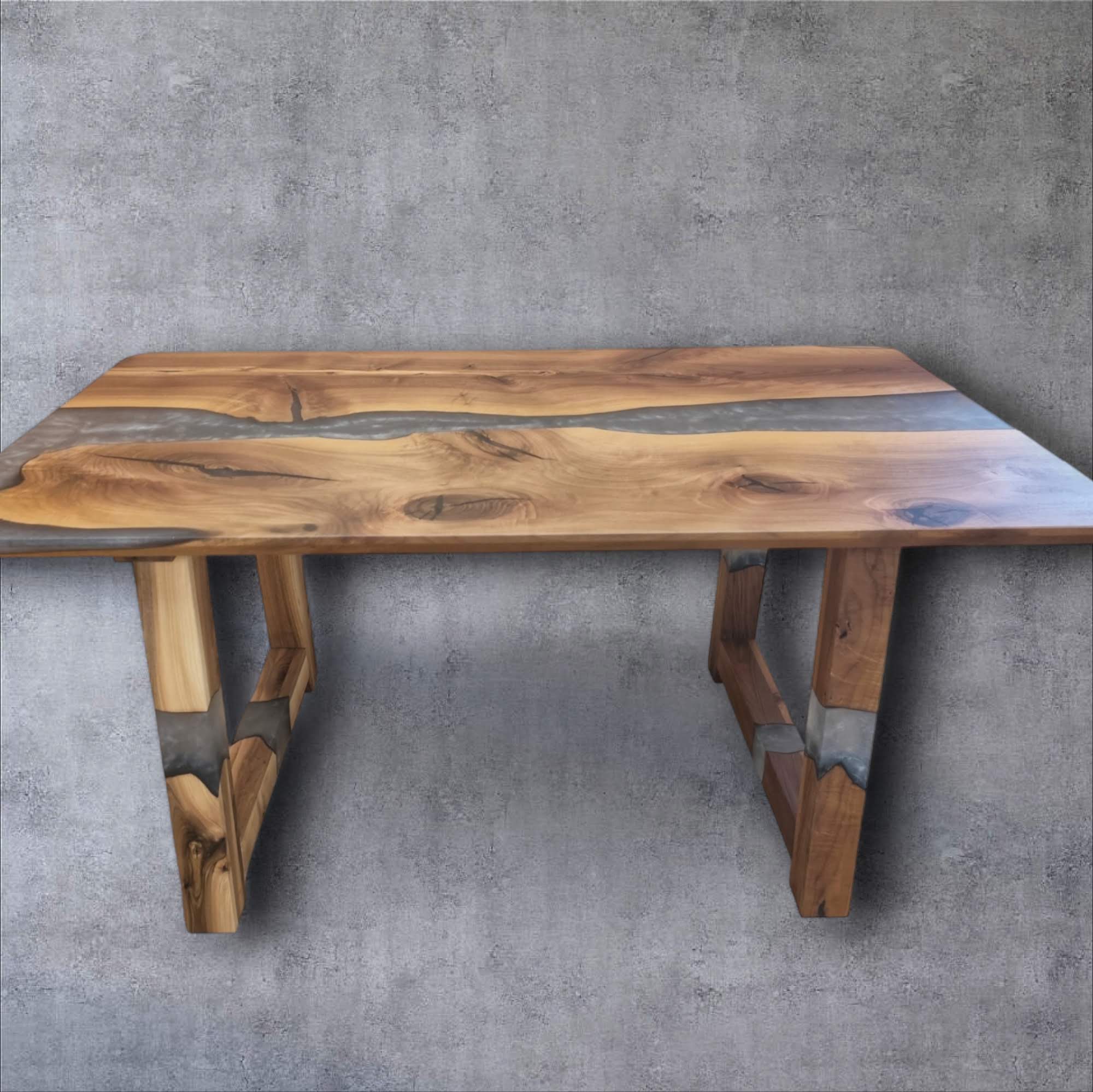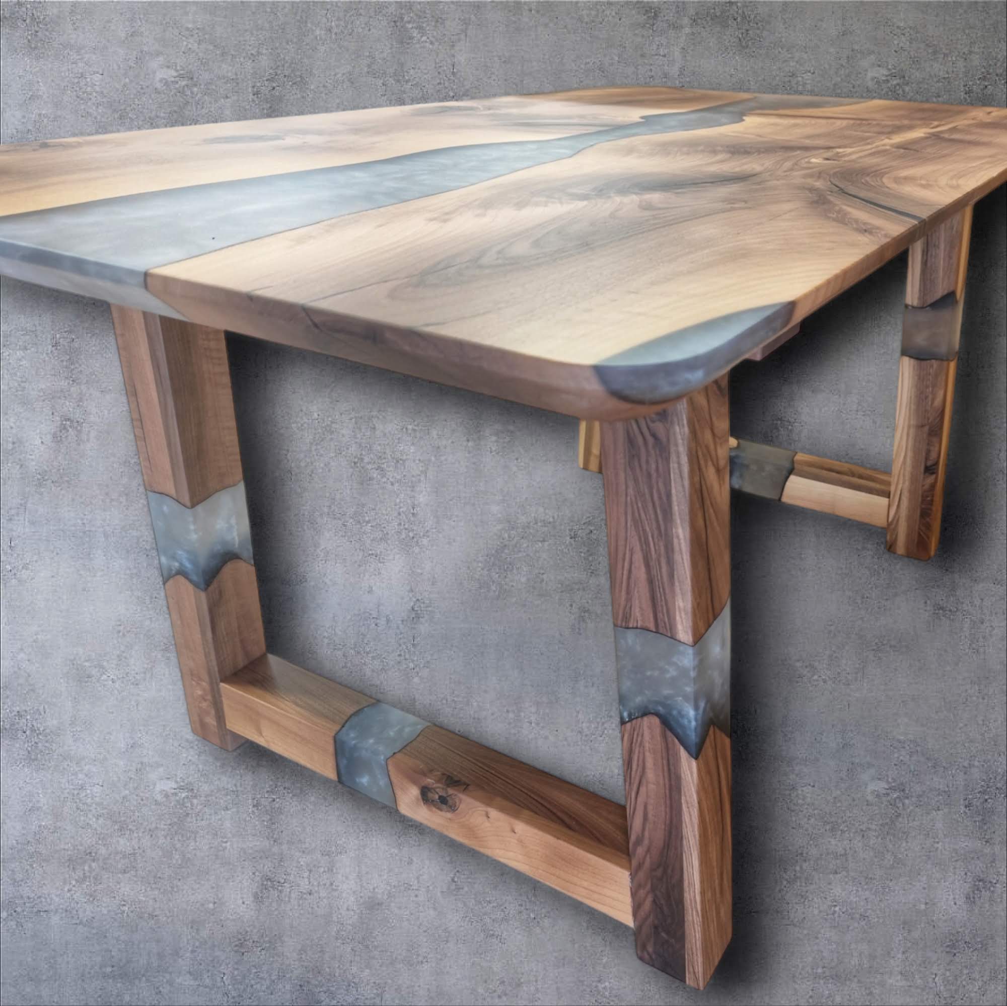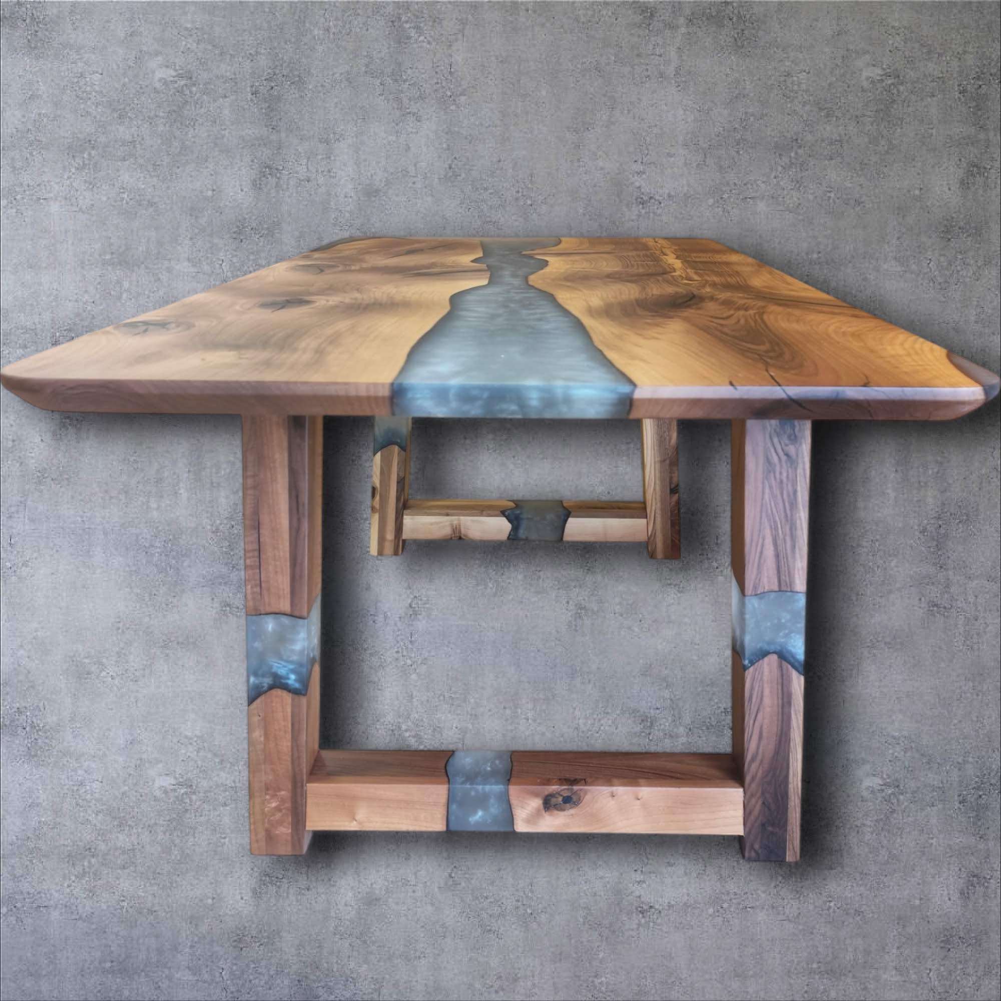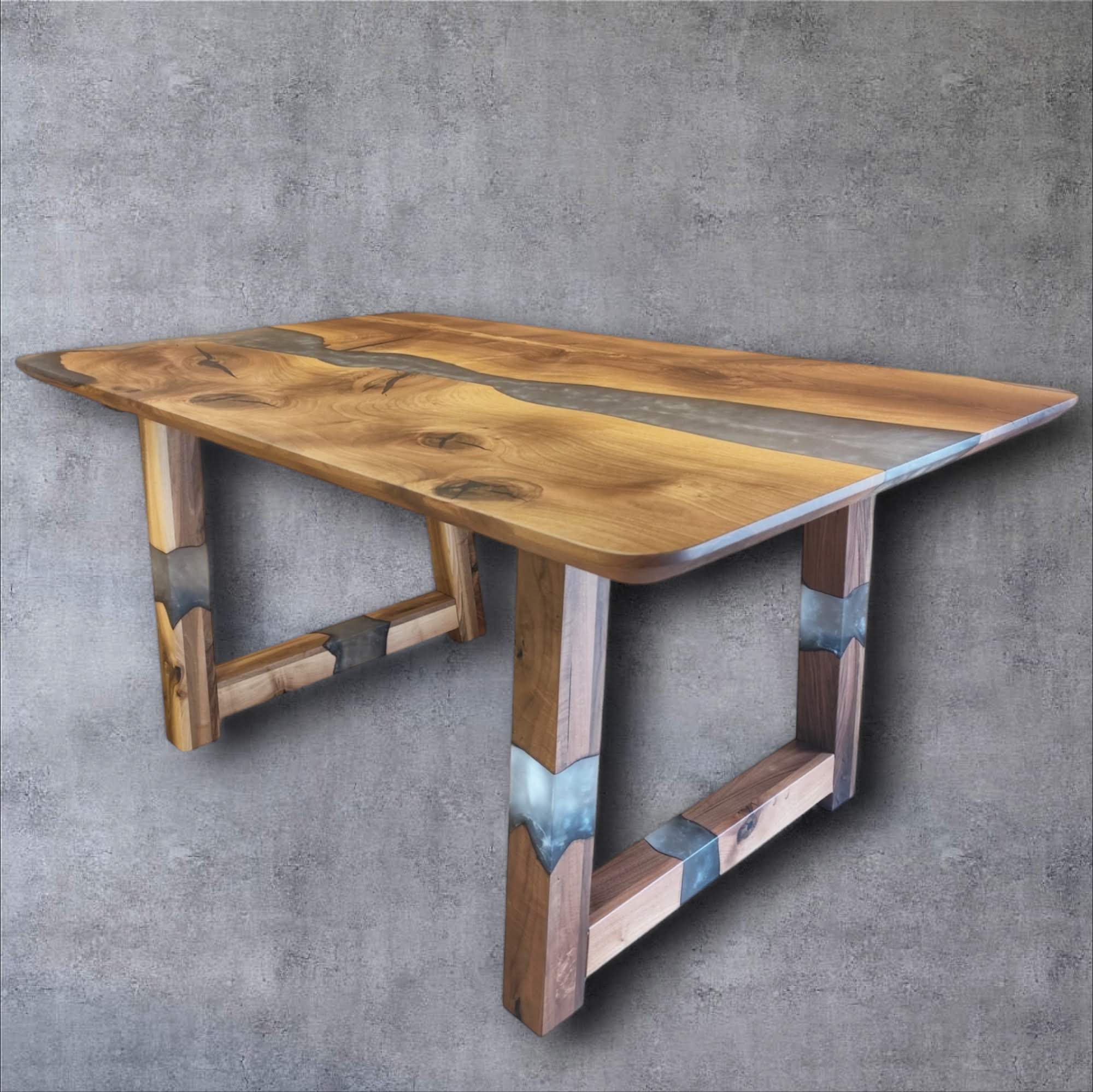 Masivna jedilna miza iz lepljene plošče evropski oreh z dodatkom epoksi smole in unikatnim podnožjem
