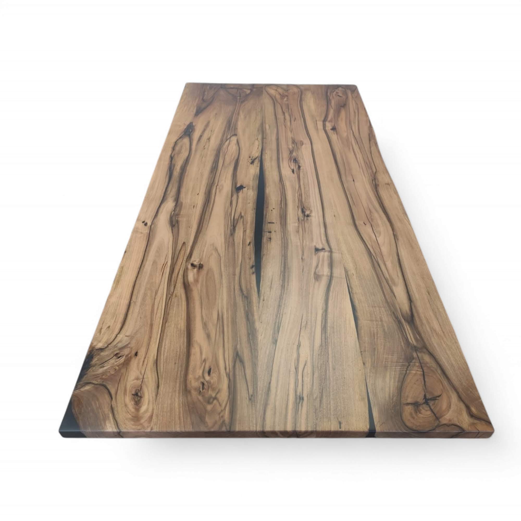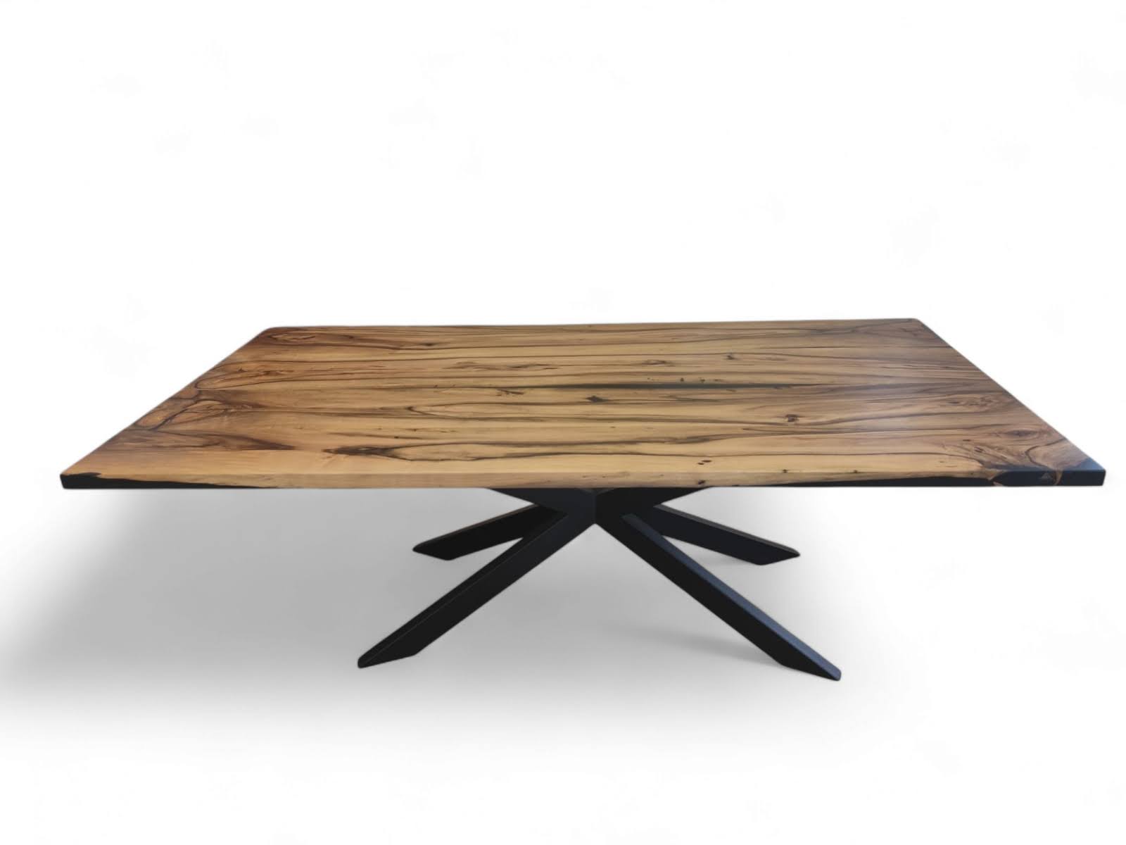 Ta masivna jedilna miza je izdelana iz lepljene plošče evropskega oreha z dodatkom črne epoksi smole. Standardna višina mize je 76 cm, debelina plošče je 4 cm, dimenzije pa so 200×95 cm. Površina je lakirana za dolgotrajno zaščito in enostavno vzdrževanje. Na voljo je izbira različnih podnožij: Model U, Model X, Križ, Asimetrična, Plus, Spider, Model I in Modern. Miza je na voljo takoj, brez čakanja. | masivne-mize.si